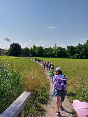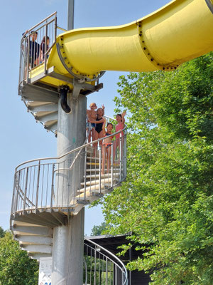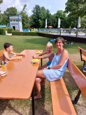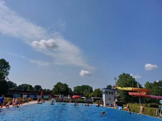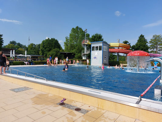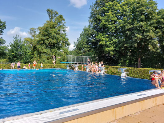 Nachdem unser Freibadbesuch wetterbedingt bereits um eine Woche verschoben wurde, konnte er nun am Dienstag, dem 15. Juli wie geplant stattfinden. Doch auch hier mussten wir bis zum Schluss hoffen und bangen, ob das Wetter halten wird, denn am Vortag wechselten die Vorhersagen der Wetter-Apps mindestens stündlich zwischen Regen, Gewitter und Sonnenschein. Aber wir glaubten fest an die positiven Prognosen und so marschierten alle Kinder bei angenehmen Temperaturen und überwiegend sonnigem Himmel nach der ersten Pause los in Richtung Schwimmbad. Mithilfe einiger Eltern und der Nachbarschaftshilfe konnten die Schülerinnen und Schüler in Kleingruppen den Vormittag verbringen. Es wurde eifrig geschwommen, getaucht, gesprungen, gerutscht oder einfach nur geplanscht und die Mädchen und Jungen hatten eine Menge Spaß. Natürlich durfte auch ein Besuch des Kiosks nicht fehlen und viele ließen sich Pommes, Eis und andere süße Leckereien, die eben zu einem Schwimmbadbesuch dazugehören, schmecken. Es war eine tolle Abwechslung zum „normalen“ Schulalltag, die sich die Kinder zum Ende des Schuljahres wirklich verdient haben. Und man mag es kaum glauben, aber zurück in der Schule, fing es dann auch an zu regnen. Glück gehabt!