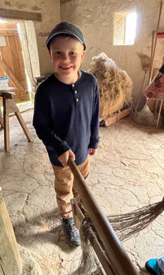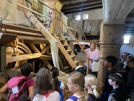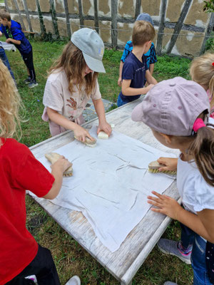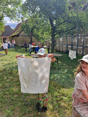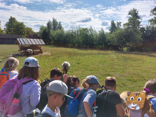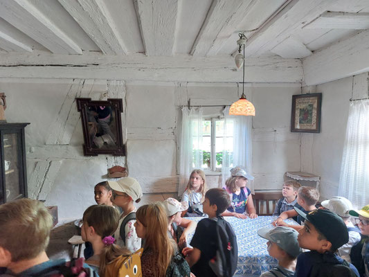 Am 23. Juli unternahm die ganze Schule mit dem Bus einen Ausflug ins Freilandmuseum nach Bad Windsheim. In einer sonst sehr verregneten Woche erwischten wir glücklicherweise den besten Tag, denn wir blieben trocken und ab und zu ließ sich sogar die Sonne blicken. Die Kinder erhielten in ihren Klassen Führungen zu den verschiedensten Themen und lernten das Leben in der Vergangenheit auf vielfältige Weise kennen. So wurde Wäsche gewaschen wie früher, natürlich ganz ohne Waschmaschine. Beim Titel "Vom Schaf zum Schal" wurde das Leben eines Schäfers näher betrachtet und die Schülerinnen und Schüler konnten selbst Garn mit einer Spindel spinnen. Ganz reflektiert erkannten die Kinder dabei, wie viel Arbeit die Herstellung von Kleidung zur damaligen Zeit bedeutete. Weitere Führungen gab es beispielsweise zu den Themen Wasser oder Märchen. Die Mädchen und Jungen lauschten interessiert den Geschichten aus der Vergangenheit und konnten vor allem in den praktischen Teilen selbst aktiv werden und sich so ein bisschen in die frühere Zeit zurückversetzen. Gestärkt ging es nach einer leckeren Brotzeit wieder nach Hause. Es war ein sehr lehrreicher Ausflug!