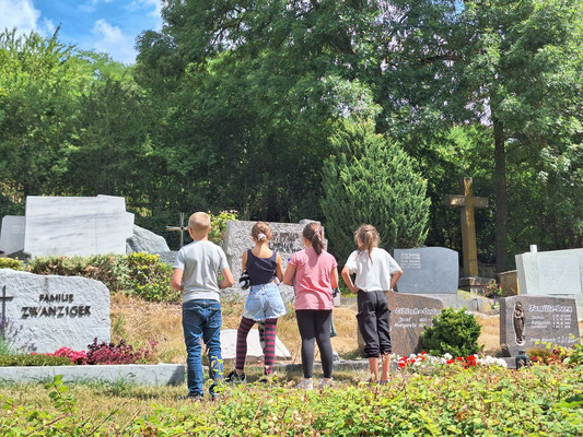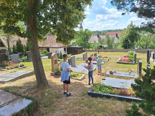 Im Rahmen des evangelischen Religionsunterrichts beschäftigten sich die dritten Klassen mit dem Thema „Abschiednehmen“. Um dieses sensible Thema anschaulich zu vertiefen, unternahmen wir am Donnerstag, den 10. Juli eine Exkursion zum Friedhof in Burghaslach. Dabei liefen die Schülerinnen und Schüler in Kleingruppen über den Friedhof und beantworteten dabei verschiedene Fragen. Sie schauten sich zum Beispiel auch Symbole und Sprüche auf Grabsteinen näher an, um die Bedeutung und die Botschaften hinter den Gravuren besser zu verstehen. Im Klassenzimmer wurden anschließend die Ergebnisse der Gruppenarbeit sowie die Empfindungen und Gefühle der Kinder besprochen.