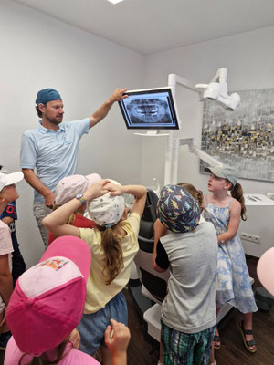 Am 1. Juli durften die Kinder der 1. Klasse vor Ort erfahren, wie in einer Zahnarztpraxis gearbeitet wird. Wir wurden dort sehr herzlich empfangen und konnten einen Blick hinter die Kulissen werfen. Während des Besuchs haben die Kinder viel gelernt: Sie durften den Röntgenraum, ein Behandlungszimmer und weitere spannende Bereiche erkunden. Dabei wurde ihnen gezeigt, wie die Instrumente gereinigt werden und welche Arbeit im Hintergrund geleistet wird, damit alles hygienisch und sicher ist. Besonders viel Spaß hatten die Kinder beim Üben des Zähneputzens und beim Ausprobieren der Wasserdusche. So konnten sie ihr Wissen über Zähne vertiefen und erweitern. Der Besuch hat nicht nur Spaß gemacht, sondern auch dazu beigetragen, das Bewusstsein für Zahngesundheit zu stärken. Wir bedanken uns herzlich bei Dr. Hofmann und seinem Team für die tolle Betreuung und die vielen Einblicke.